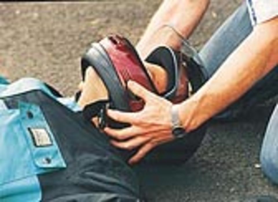 Foto: A. Zelck / DRK e.V.Der Helfer zieht den Helm soweit ab, dass er mit einer Hand den Hinterkopf des Betroffenen von unten stützen kann. Anschließend wird der Kopf des Betroffenen vorsichtig auf dem Boden abgelegt. Der Helfer wechselt seine Position an die Seite des Betroffenen und hält dabei dessen Kopf fest.
